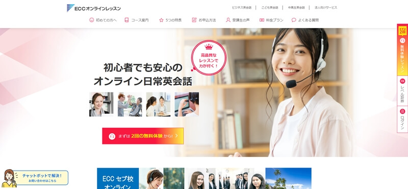 ![]() ECCオンラインレッスン | 公式サイト | 講師や回数を選べるプランが豊富 | ・初心者 ・ビジネス英会話 ・こども ・中高生 | 220円~770円(フィリピン講師・通常プランの場合) | ・フィリピン講師 通常プラン 月額3,080円~(月4回) 月額4,620円~(月8回) 月額8,866円~(1日1回) 月額13,640円~(1日2回) | 月額制 | 入会金なし 教材費なし | 25分 | 10時~24時 (フィリピン講師・通常プラン) | フィリピン講師・ネイティブ講師・バイリンガル日本講師ごとに価格が異なる |