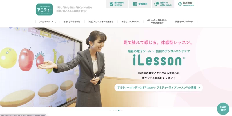 ![]() アミティー | 公式サイト | 満6ヶ月~高校3年生 | 月謝制 or 一括回数制 ※年齢による | 1レッスン30~50分 | 外国人講師 日本人講師 | 全国各地の教室 |