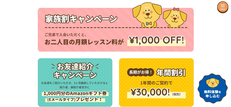 家族割りキャンペーン兄弟で入会で2人目のレッスン料が1,000円OFF
