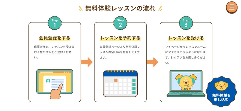 子どもの名前など個人情報を入力して会員登録をした後、レッスン希望日時を選択。当日はマイページからレッスンルームに入ればレッスンを受けることができます。